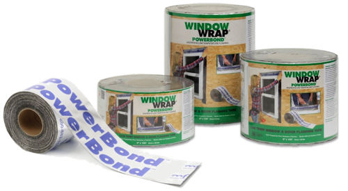WindowWrap PowerBond Shrink-Wrapped rolls are labeled for individual sale. Product is a self-adhering 25 mil waterproofing flashing tape constructed of a tough, aluminized, multi-layer polymer film. It is coated with a patented PowerBond adhesive system that allows the product to be applied in temperatures as low as 25°F (-4°C), while remaining stable at elevated temperatures. The aluminum surface can stand up to a maximum of 180 days of UV exposure. WindowWrap PowerBond effectively stops water leaks around windows and doors while reducing outdoor noise and air infiltration. The aggressive adhesive securely bonds the window flange to the exterior wall, and the rubberized asphalt self-seals around nails and other construction fasteners. Complies with AAMA 711-07 as specified in ICC-ES AC148, Report ICC-ES ESR 2783. Backed by a 15-Year warranty.